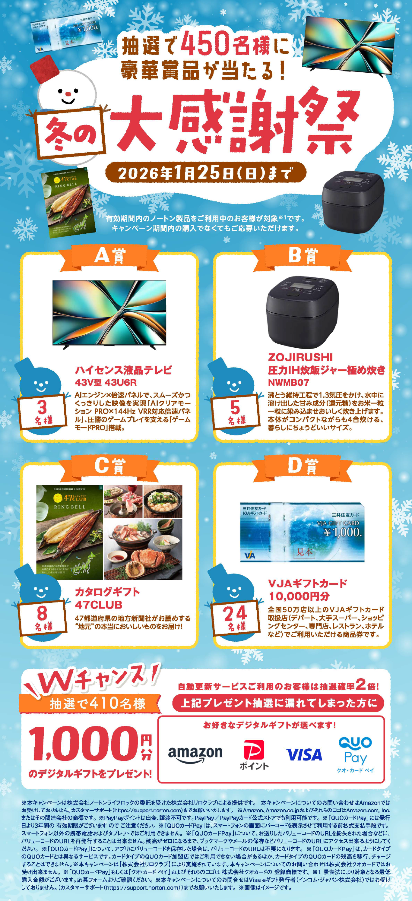 ・本キャンペーンについてのお問合せはVisaeギフト発行者(インコム・ジャパン株式会社)ではお受けしておりません。カスタマーサポート(https://support.norton.com)までお願いいたします。