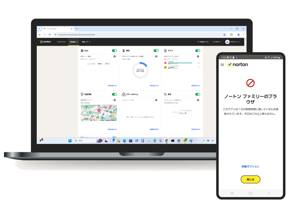 ‡ ノートン ファミリー/保護者機能は、お子様の Windows™ パソコン、iOS デバイス、Android™ デバイスにのみインストールして使用できます。ただし、一部のプラットフォームでは利用できない機能があります。保護者は、モバイルアプリを使用して、または my.Norton.com でアカウントにサインインして、任意のブラウザで保護者機能を選択することにより、Windows (Windows S モードを除く)、Mac、iOS、Android などの任意のデバイスからお子様の行動を監視して管理できます。モバイルアプリは別途ダウンロードする必要があります。iOS アプリは、 一部の国を除くすべての国や地域で利用することができます。