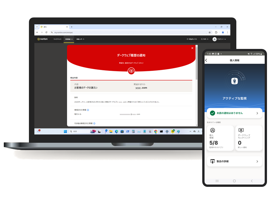 § ダークウェブモニタリングは、一部の国では使用できません。監視対象の情報は、居住している国や選択した製品によって異なります。デフォルト設定の場合、監視対象は電子メールアドレスになります。電子メールアドレスの監視はすぐに開始されます。監視対象の情報を追加する場合は、ノートンアカウントにサインインしてください。
